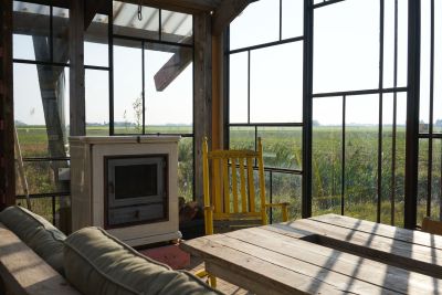 Het Oer-IJ huisje is van alle gemakken voorzien. Met, als hoogtepunt, een grote serre met weids uitzicht over de polder en een kacheltje. Perfect om een boek te lezen, met de verrekijker opzoek te gaan naar de uil of gewoon om voor je uit te staren